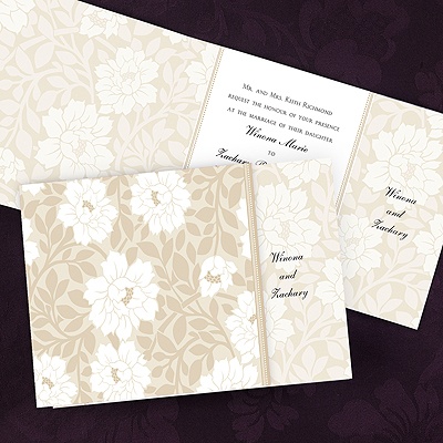 Wedding invitations feature white blooming flowers that are set on a champagne colored background.